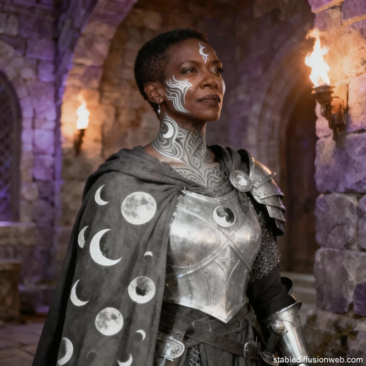 Femme entre deux âges, elle était habillée d'une robe blanche et noire et tatouée avec des marques complexes, d'apparence elfiques, d'une couleur mithril sur les bouts de corps apparents, incluant le visage. Dégageait une impression de bienveillance.